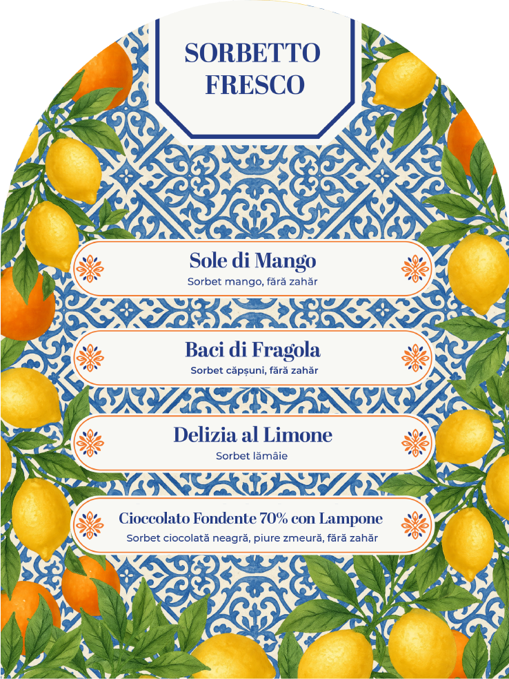 Preparăm gelato-ul integral în propriul nostru laborator artizanal, de la zero, cu respect pentru rețetele tradiționale și ingredientele atent alese. Cream zilnic arome clasice, gurme și combinații originale, inspirate din cultura siciliană și din gusturile transilvănene. Fiecare sortiment este creat pentru a transmite o emoție, pentru că fiecare gust merită timp, respect și o poveste proprie.